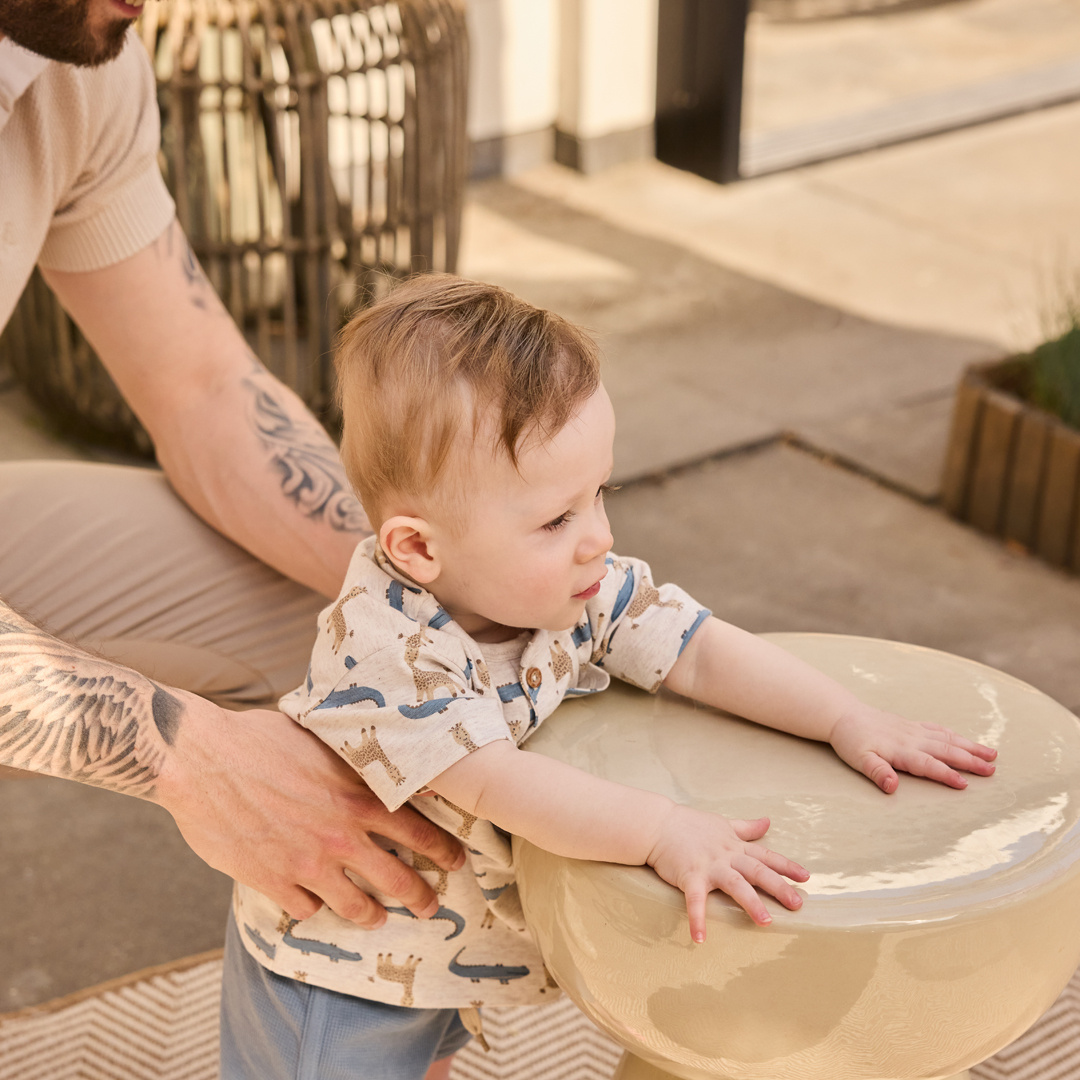 On warm spring days and sunny summer days, this Dirkje jogging shorts set in blue and sand is a great basic for your little one. The soft cotton is airy and comfortable, and the drawstring waistband ensures a snug fit during play and activity. The shorts are extra cute thanks to the beautiful textured fabric. Perfect for mixing and matching with the matching T-shirts.