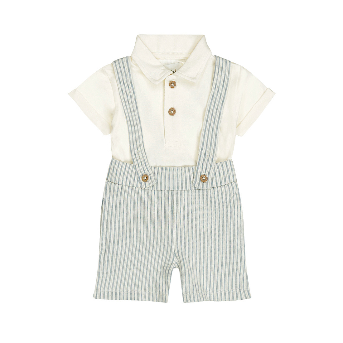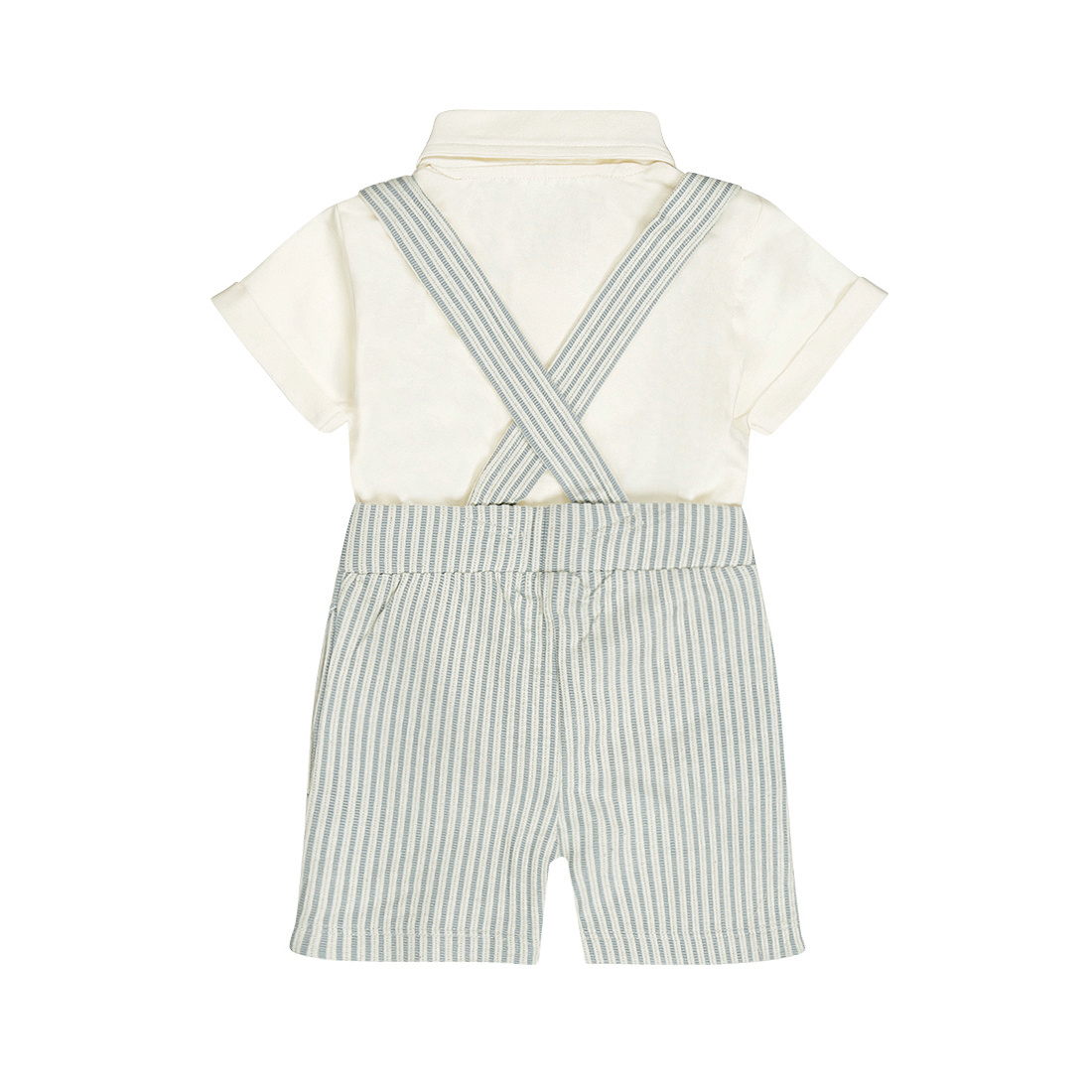 For a fresh, polished look, choose the Dirkje set, featuring a polo shirt and seersucker dungarees in blue and off-white stripes. The suspenders and button details make it extra cute for little boys, and the fabric is comfortable to wear during play and exercise. This boys' polo shirt and dungaree shorts set is perfect for warm weather and looks great with sneakers or sandals.