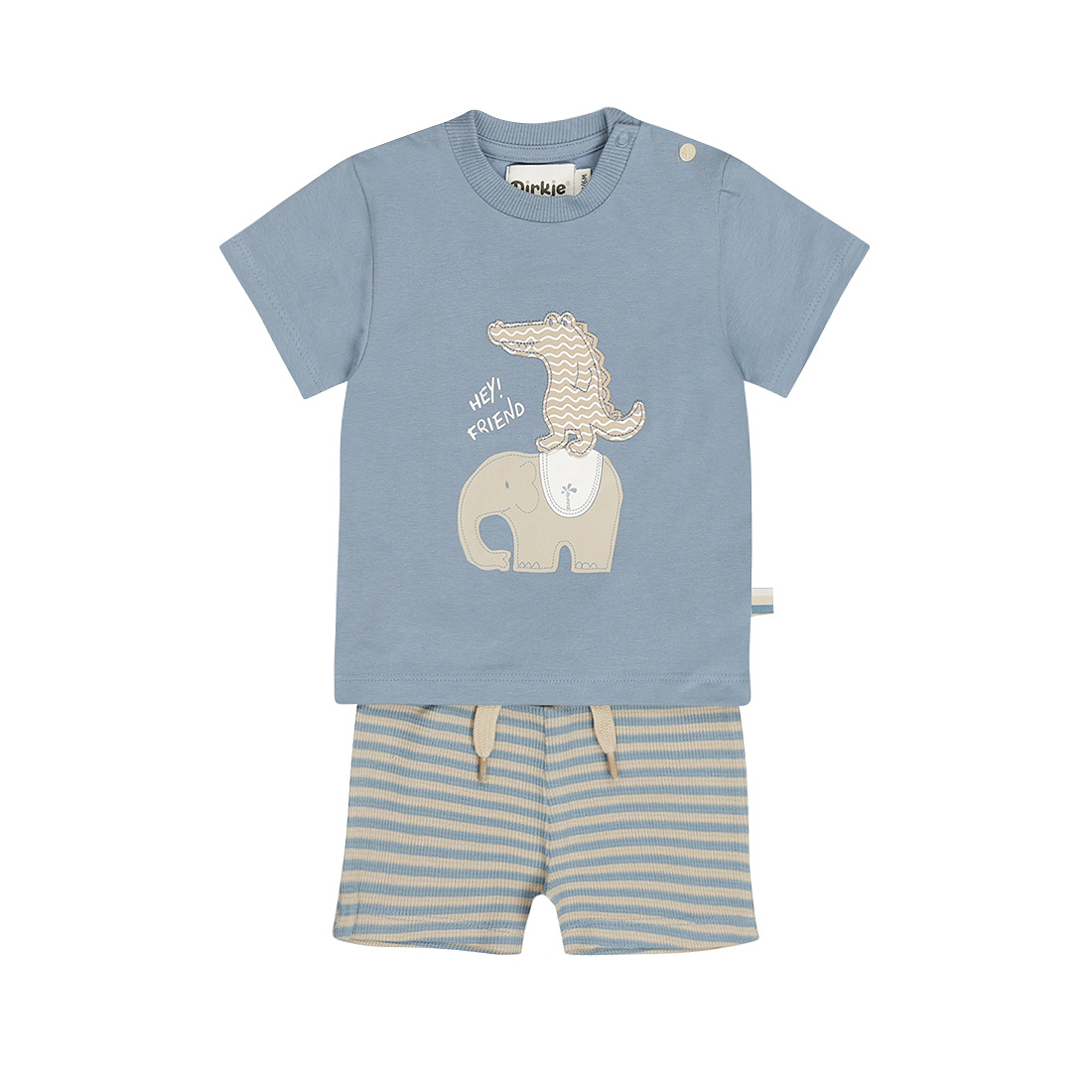 Time for a fresh look! This Dirkje set in blue and sand striped shorts is a great choice. The elephant and crocodile print on the T-shirt makes it extra fun for little boys, and the striped shorts are comfortable thanks to the soft cotton. This boys' outfit, consisting of a shirt and shorts, is available in sizes up to 86 and features snaps on the shoulders and is easy to pair with sneakers or sandals.