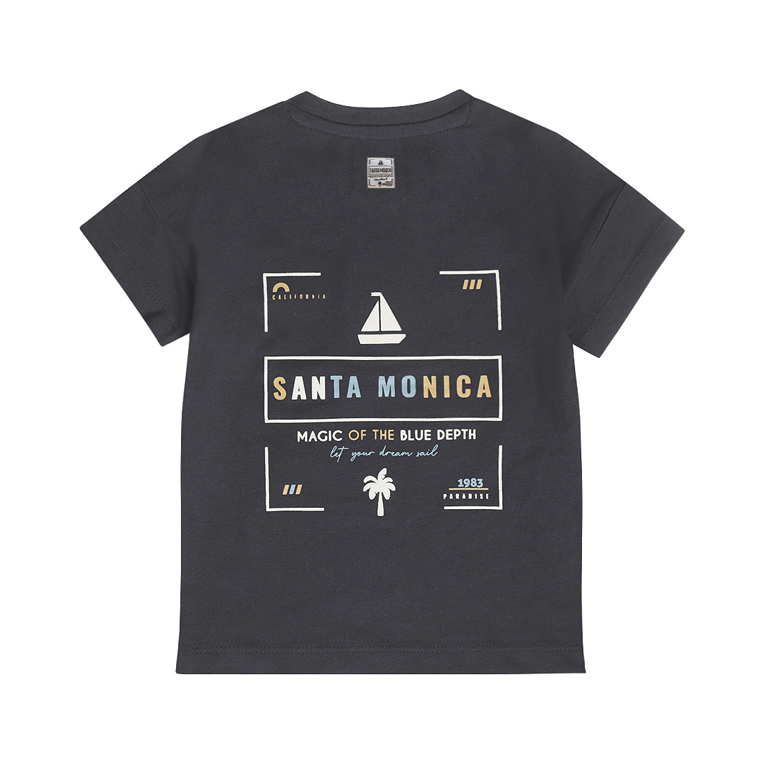 This dark blue Dirkje T-shirt is a great basic with a summery twist. The soft stretch cotton fabric is wonderfully comfortable. The buttons and the Santa Monica print on the back give this shirt a playful and summery feel. This boys' short-sleeved shirt is a real favorite for sunny days.