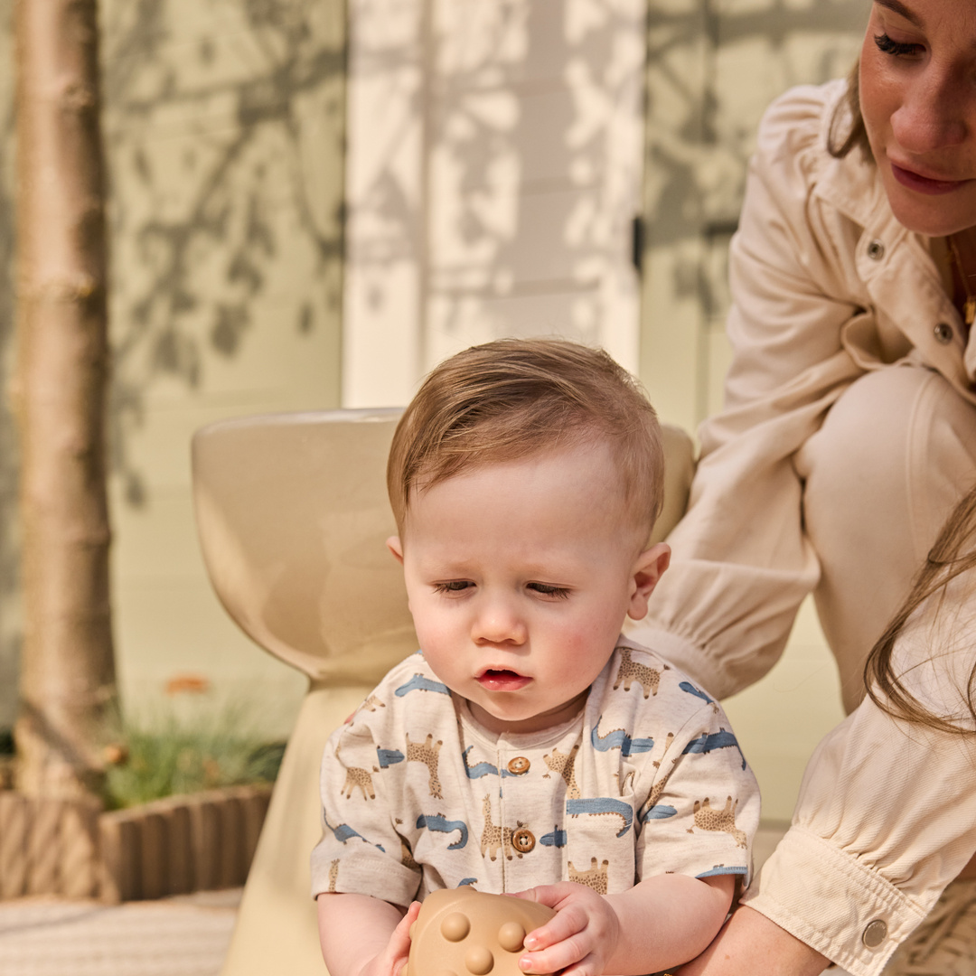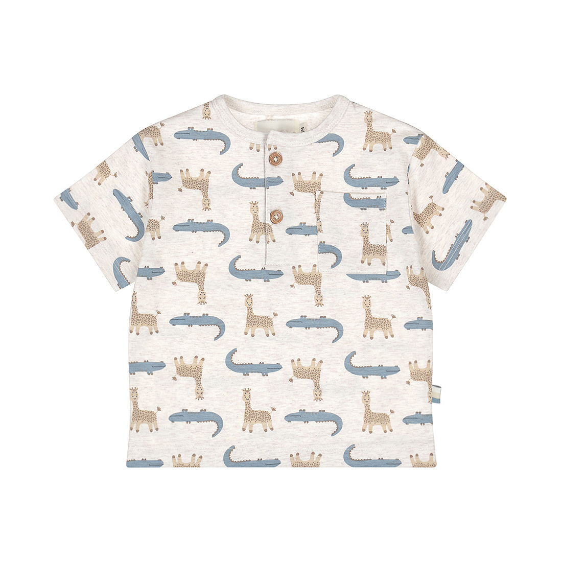 A fresh color and a fun print make the Dirkje loose-fit T-shirt with animal print perfect for warm weather. The soft, stretchy fabric gives your little one complete freedom of movement while playing and exploring. This off-white, heathered short-sleeved boys' T-shirt is available in sizes up to 86 and features buttons for easy changing.