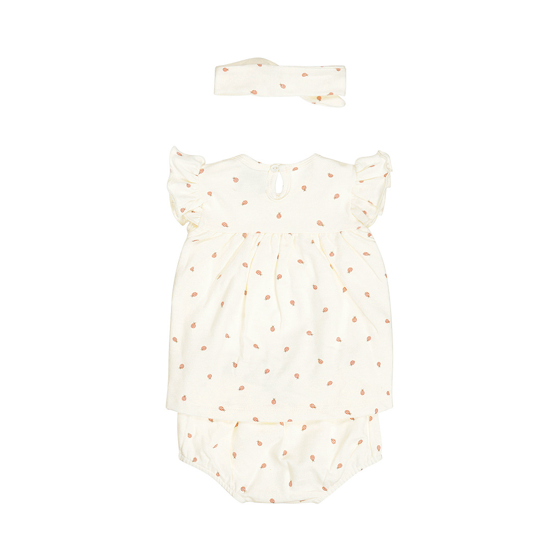 A sweet little outfit for the littlest ones! This Dirkje baby dress with diaper pants and headband is made of soft, stretchy cotton in off-white. The dress features short, ruffled sleeves and an all-over ladybug print, creating a playful look. A button at the back of the neck makes it easy to put on and take off, perfect for your little one. The matching diaper pants and headband with a bow complete this girls' outfit.