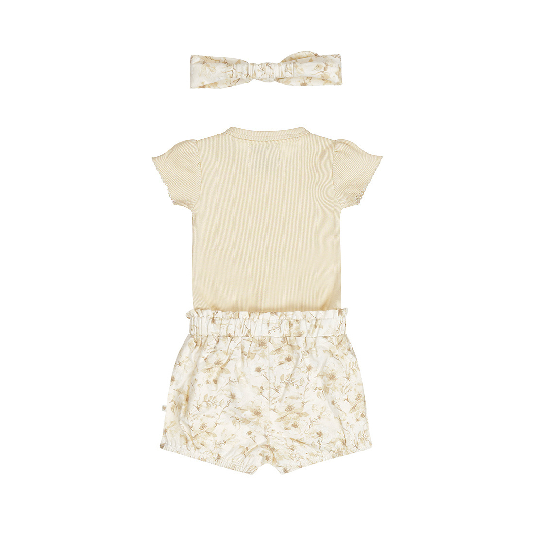 A sweet and comfortable set for summer days: this Dirkje baby set includes a romper, shorts, and a headband. The sand-colored romper for girls has short puff sleeves with a dainty trim. The off-white shorts feature a pretty floral print, an elastic waistband with a bow, and elasticated legs for a perfect fit. The matching headband with a bow completes the outfit and adds an extra touch of sweetness. Made of soft, stretchy cotton.