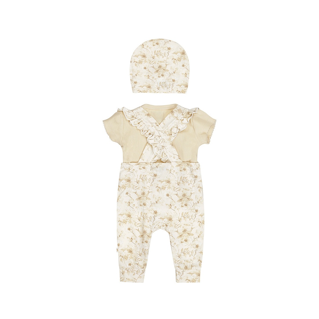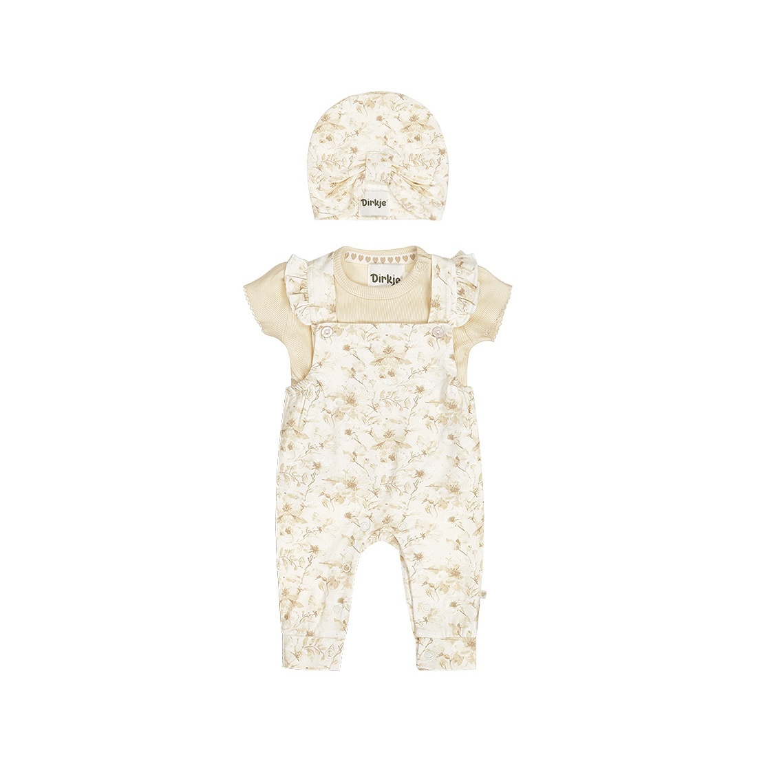 This Dirkje baby set is a complete outfit for your little one, perfect for spring and summer. The sand-colored girls' T-shirt has cute puff sleeves with a delicate trim, and sizes up to and including 86 feature snaps on the shoulders for easy dressing. The off-white dungarees feature a beautiful blossom print and adjustable ruffled straps for a playful touch. The set is completed with a matching turban hat in the same blossom print. Made of soft, stretchy cotton for extra comfort.