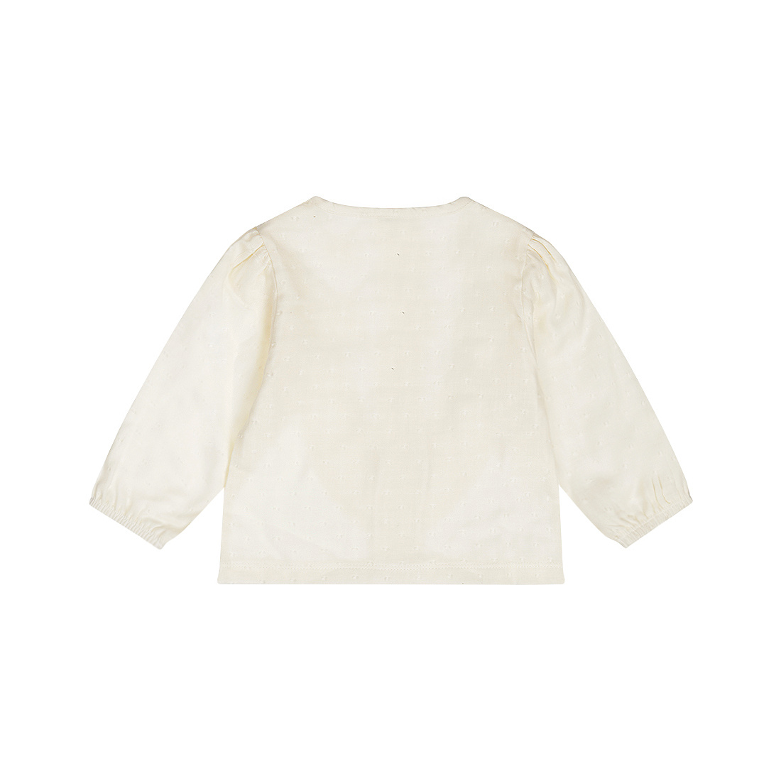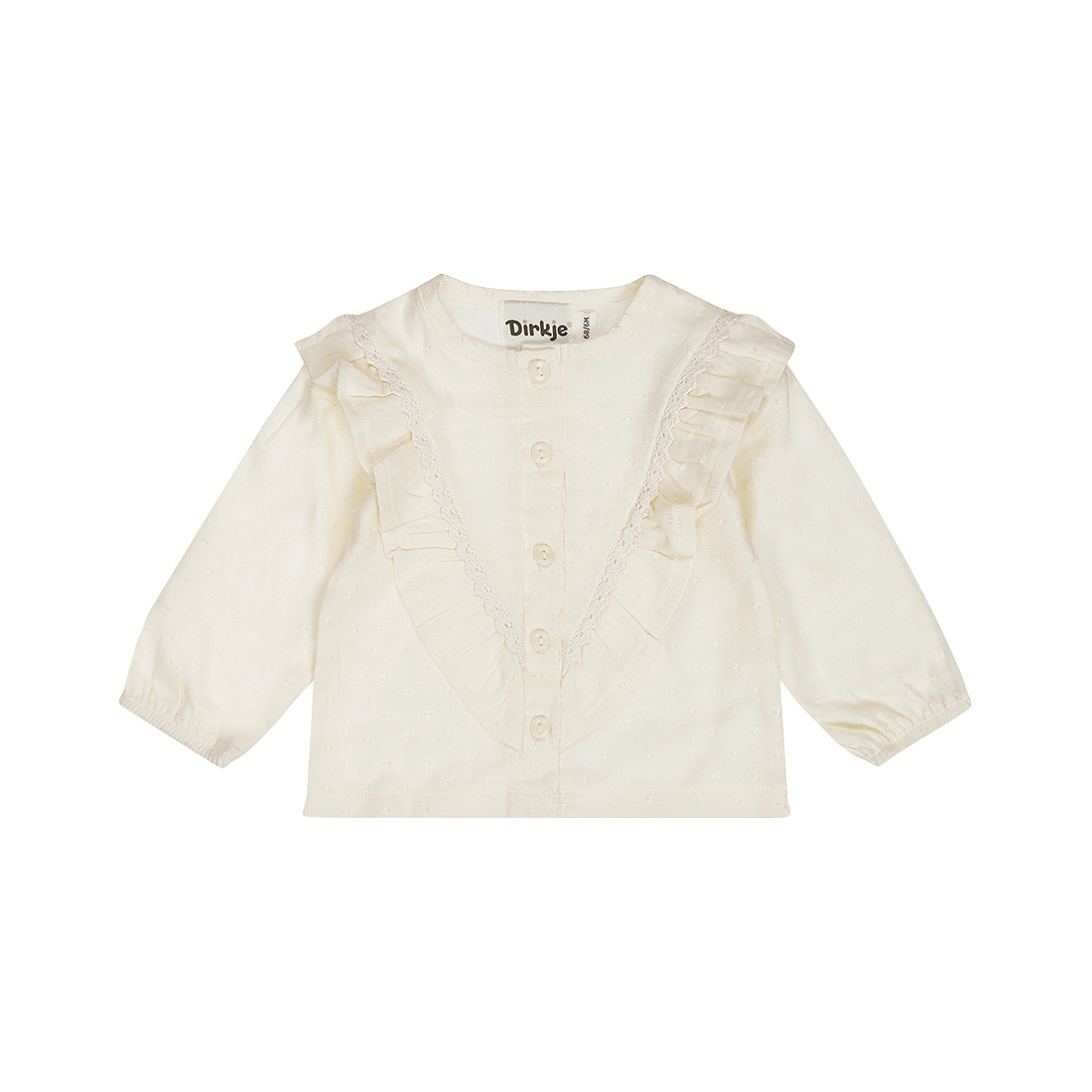 Soft and stylish: this off-white Dirkje blouse with long sleeves is a lovely choice for a sunny day. Made of 100% cotton, it features buttons down the front. The ruffles across the front and the subtly woven dot in the fabric add a touch of elegance. Pair it easily with jeans or a skirt for a complete look.