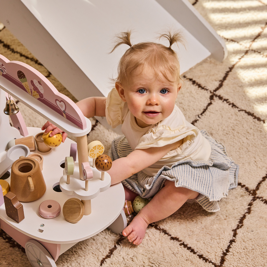 Create a fresh, summery look with the Dirkje dress and headband set in blue and white. The layered skirt in seersucker fabric creates a cheerful effect, and the ruffled sleeve top feels soft on your little one. This girls' dress is available in sizes up to EU 86 and features snaps on the shoulders, and the matching headband completes the look.