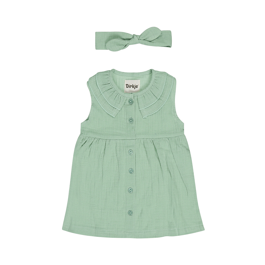 This Dirkje dress with a headband in a beautiful green hue is made of muslin cotton and is therefore wonderfully airy, perfect for summer days. This girls' summer dress is sleeveless and features a sweet collar, a slightly flared skirt, and buttons at the front. The matching headband with a bow completes the outfit and adds an extra touch of sweetness.