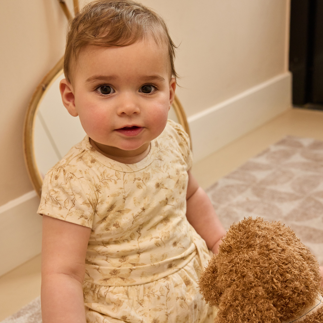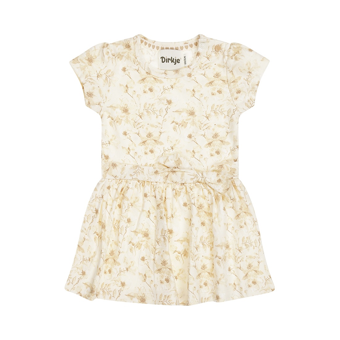 This sweet dress will create a soft, summery look for your little girl. This Dirkje dress in off-white is made of stretch cotton and features an all-over floral print in soft hues. The material is comfortable and flows smoothly with your little one. The dress features short puff sleeves, a playful tie at the waist, and a slightly flared skirt. A lovely choice for both a party and a casual summer day.