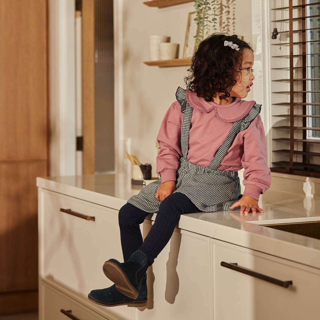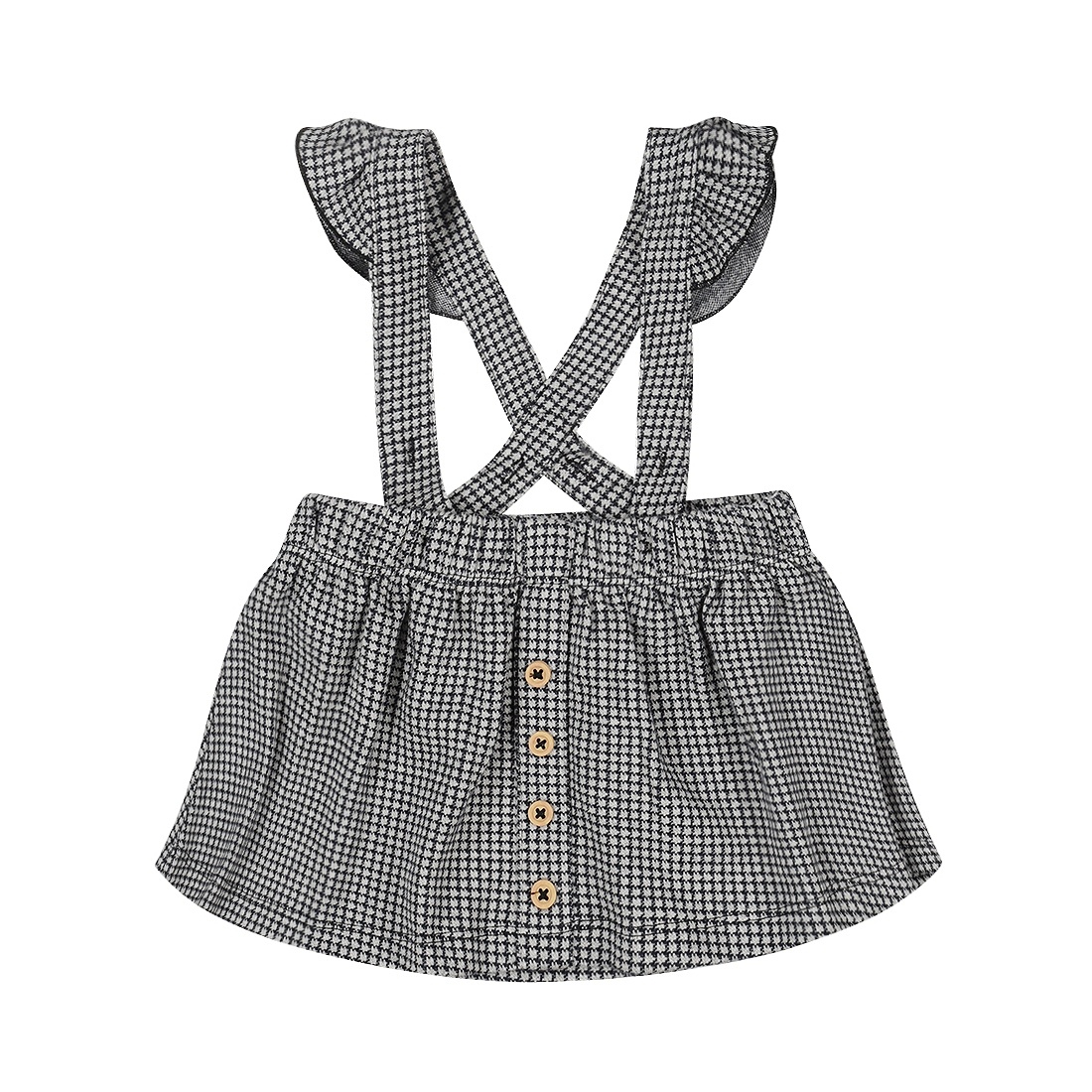 This adorable Dirkje pied-de-poule print dress is a real must-have for your little one! The off white and dark blue pattern gives the dungarees dress a classic look, while the crossed adjustable straps and cute ruffles on the shoulders provide a playful twist. The skirt section of the girls' dress features buttons at the front for added detail. Perfect to pair with a longsleeve or sweater.