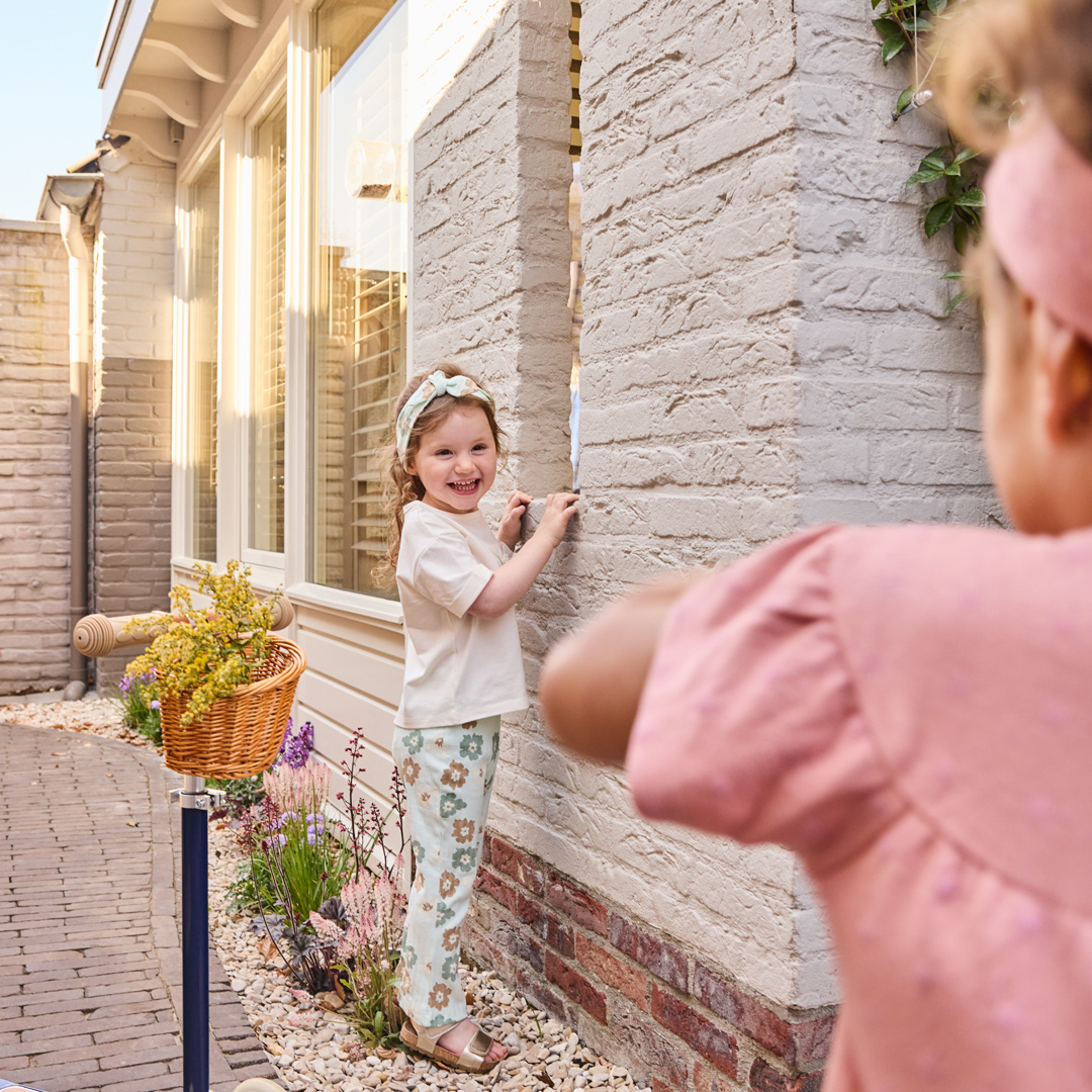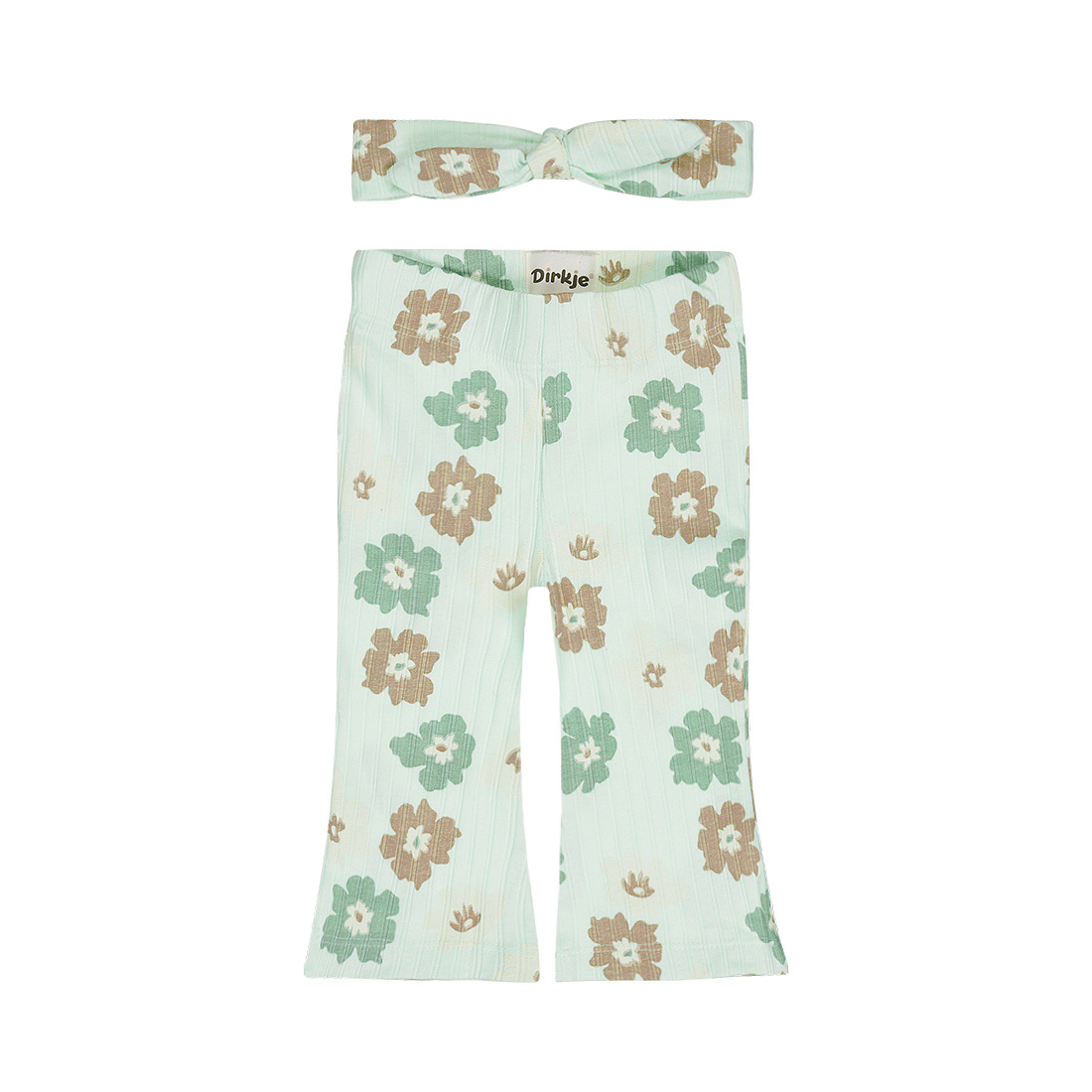 A cheerful outfit for a summer day. These Dirkje flared leggings with a headband are made in light green with a playful floral print and a subtle textured fabric. The girls' leggings have flared legs for a trendy look and are comfortable thanks to the soft fabric. The matching headband with a bow completes the outfit and adds a sweet touch.