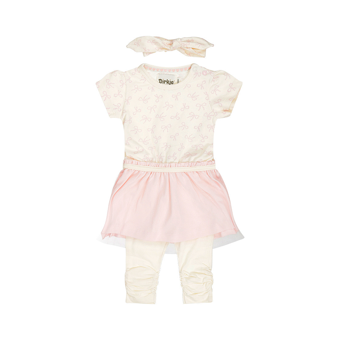 Ready for the day in one outfit! This Dirkje dress features an off-white top with an all-over bow print and a light pink skirt with a tulle layer for an extra playful look. The outfit comes with off-white leggings with ruffles at the hems and a matching headband with a bow. This girls' outfit is made of stretch cotton and combines comfort with sweet details, making it ideal for both everyday wear and special occasions.