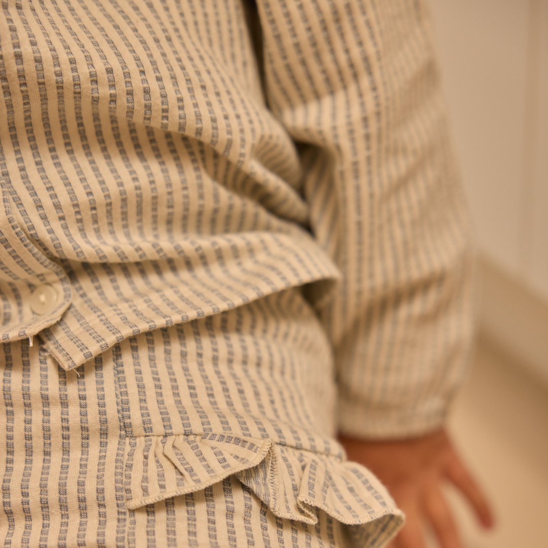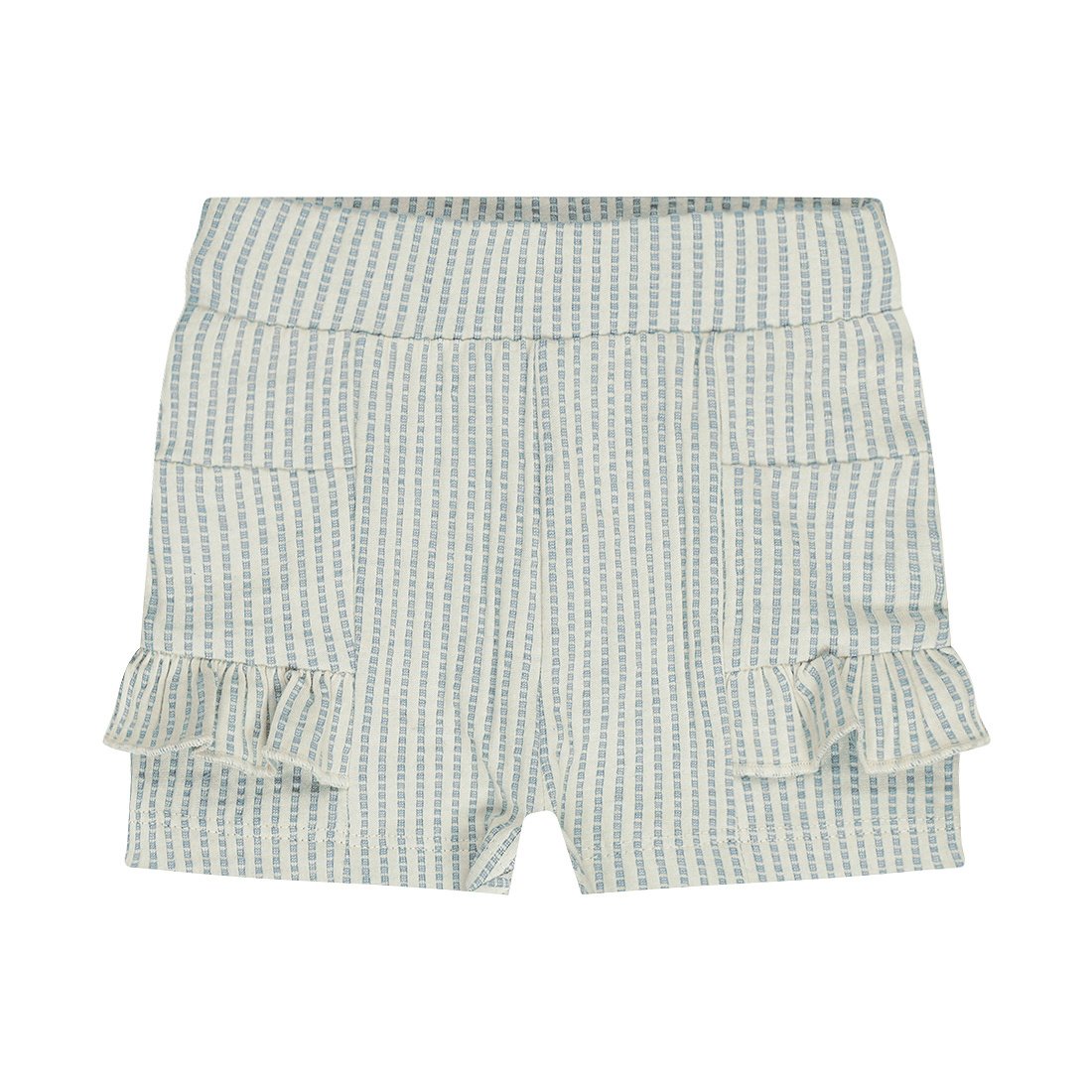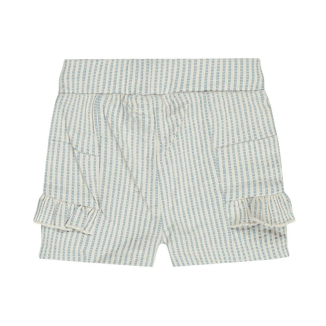 Enjoy the sunshine and let your legs run free, then the Dirkje girls' shorts in blue and white striped seersucker fabric are just what you're looking for. The seersucker cotton is airy and comfortable, and the playful ruffles add a touch of sweetness. These girls' shorts are perfect for daycare, a day out, or just playing outside.