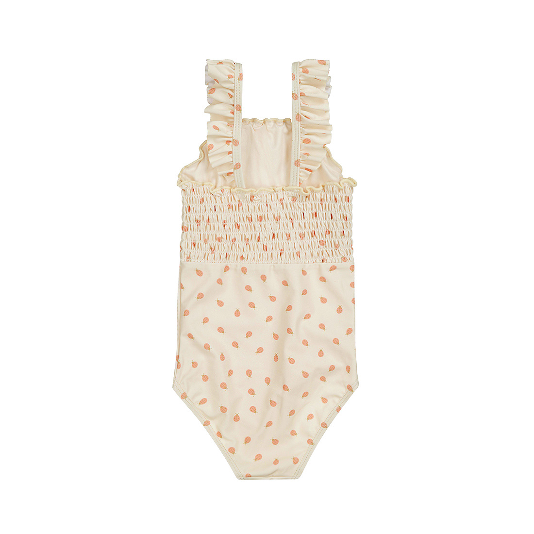 On warm summer days, the Dirkje girls' swimsuit in off-white is a sweet choice for your little water baby. The ladybug print creates a cheerful look, and the ruffles make it extra cute. The material feels soft and dries quickly, perfect after swimming and playing. This girls' swimsuit is perfect for the pool, the beach, or a day in the garden.