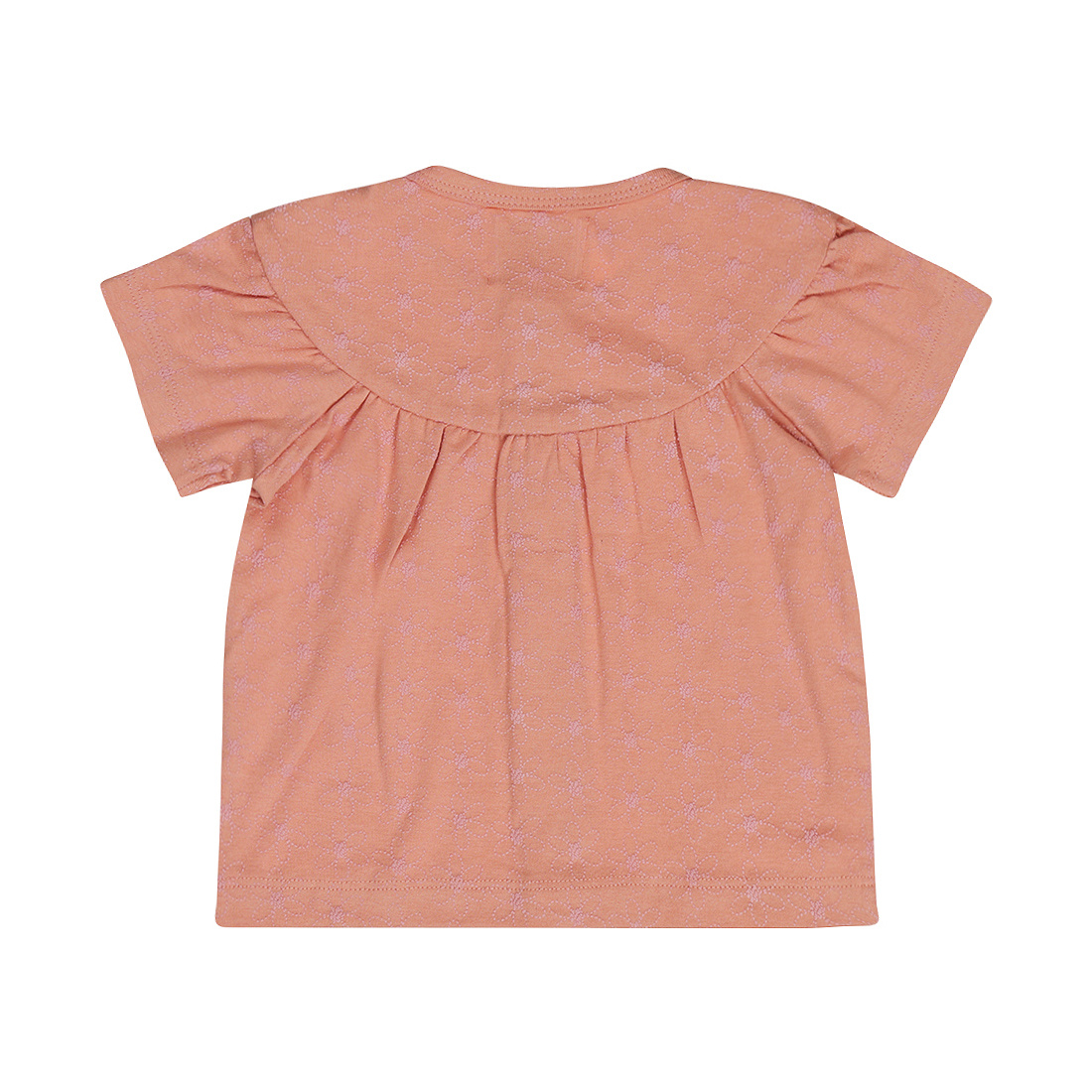 Soft pink, sweet, and comfortable, the pink Dirkje T-shirt with buttons and embroidered flowers is perfect for spring and summer. The stretch fabric allows your little one to move freely without feeling constricted. This blouse-style T-shirt for girls pairs beautifully with shorts or jeans.
