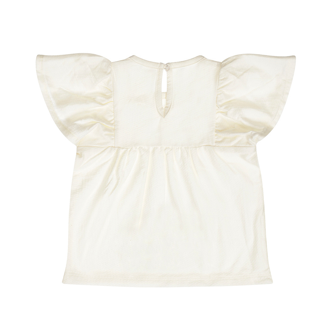 Light and airy: this Dirkje shirt in off-white is a great choice for summer days. This girls' shirt features playful short sleeves and a subtly flared silhouette for a sweet look. A button at the back of the neck makes it easy to put on and take off. Made of soft, stretchy cotton with a fine texture for added charm.