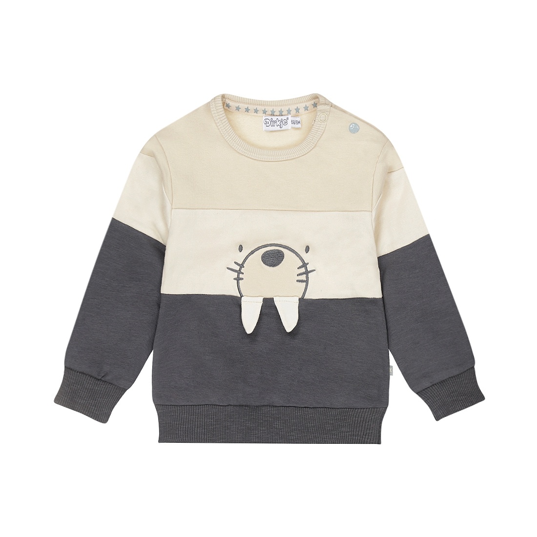 Deze Dirkje sweater is een vrolijke aanvulling voor de wintergarderobe. De speelse combinatie van lichtbruin, off white en donkerblauwe kleurvlakken geeft een stoere look, terwijl de lieve walrusprint op de voorkant zorgt voor een schattig accent. Gemaakt van zachte katoen met stretch, waardoor je kleintje zich de hele dag prettig voelt. De jongens trui is makkelijk te combineren met een jeans of joggingbroek uit de Dirkje collectie.