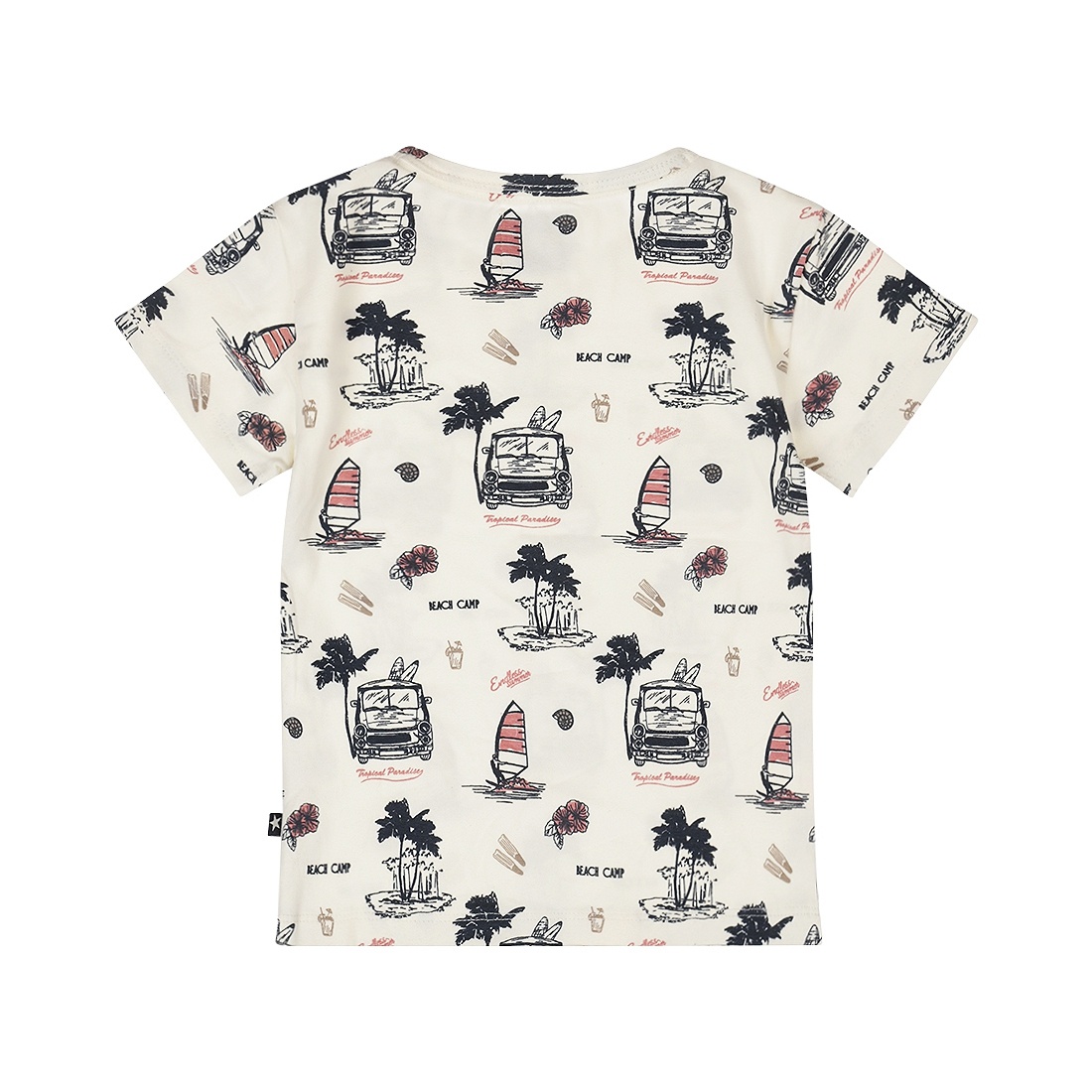 Het Dirkje T-shirt in off white met donkerblauw en oudroze details brengt instant vakantiegevoel in de kledingkast. Gemaakt van katoen met stretch voelt het shirt zacht aan en zit het comfortabel, ook op warme dagen. De all over print met stranditems maakt het extra schattig en speels. De maten t/m 86 zijn voorzien van drukkers op de schouders, zodat omkleden extra makkelijk gaat. Dit korte mouwen shirt voor jongens staat perfect op een denim short of luchtige broek.