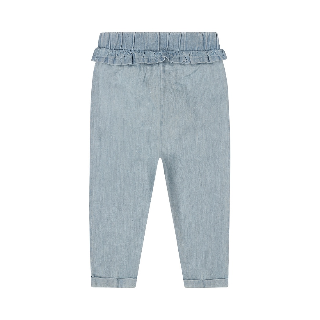 Voeg een speelse en comfortabele touch toe aan de garderobe van je kleintje met deze Dirkje broek. Gemaakt van 100% katoen, biedt deze broek een lichte en ademende stof met een trendy jeans look in blauw. Het dunne, zachte materiaal en het iets losse model zorgen voor een ontspannen pasvorm. De meisjes broek heeft opgerolde pijpjes en schattige ruffles rondom de elastische boord, wat zorgt voor een extra lief detail.