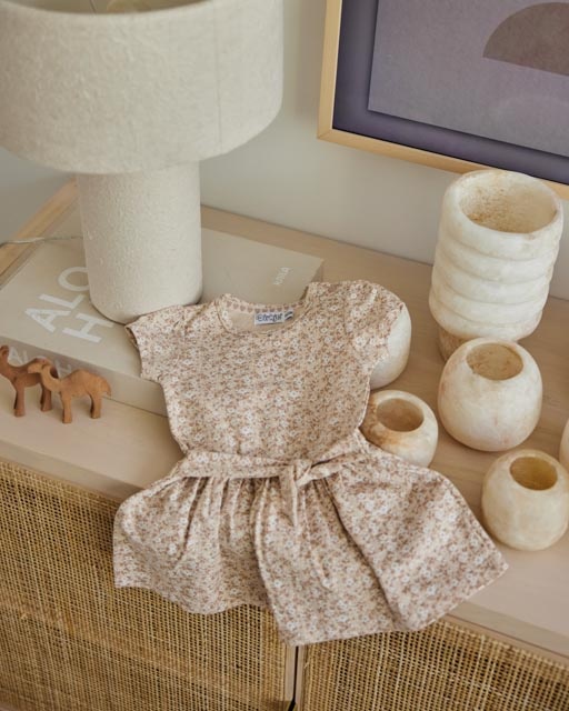 Geef je kleintje een schattige en zomerse look met dit lieve Dirkje jurkje. De meisjes jurk in een zachte beige kleur is versierd met kleine bloemetjes, wat zorgt voor een speels en charmant effect. Met korte mouwen en een strik in de taille is het een perfecte keuze voor elke dag.