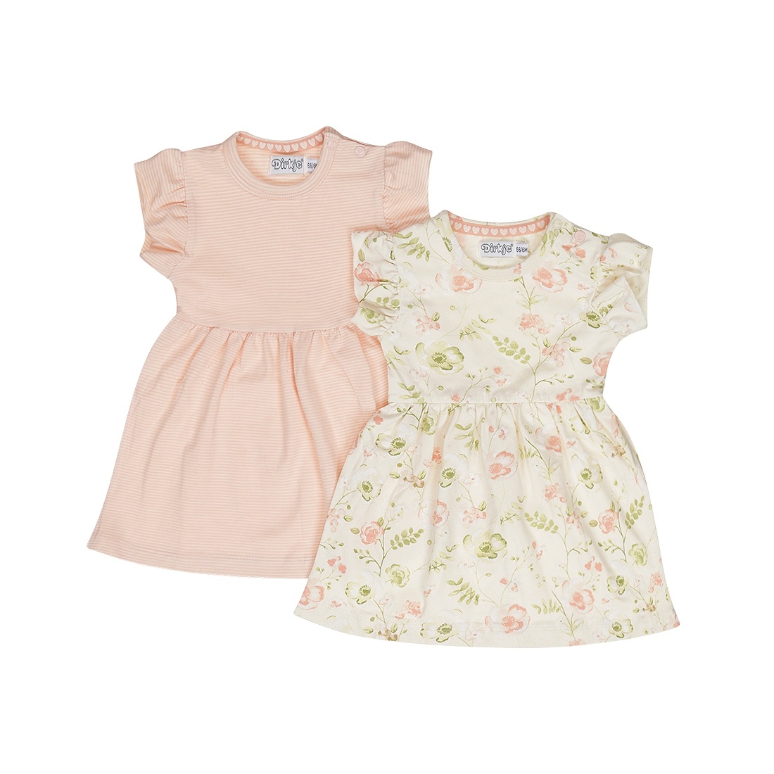 Deze lieve Dirkje set bevat twee zomerjurkjes, ideaal voor warme dagen. Beide meisjes jurken zijn gemaakt van katoen met stretch. Ze hebben korte mouwen en een uitlopend rokgedeelte, wat zorgt voor een speelse uitstraling. De set bestaat uit een perzikroze jurkje met streepjes en een off white jurkje met een schattige bloemenprint in groen en roze. Maatjes tot en met 86 zijn voorzien van handige drukkers op de schouder.