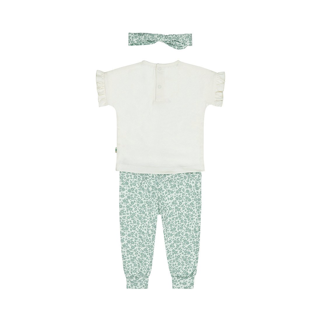 Deze Dirkje set met T-shirt, broek en haarband is gemaakt van zacht katoen met stretch en combineert comfort met een lieve uitstraling. Het off white meisjes T-shirt heeft korte mouwen met ruffles, een schattig peertje op de voorkant en de maatjes tot en met 86 zijn voorzien van handige drukkers achter in het nekje voor makkelijk aan- en uittrekken. De bijpassende broek met lichtgroene all-over print met bloemetjes heeft een elastische tailleband met sierkoordje en comfortabele boorden, en de haarband met dezelfde print maakt het setje helemaal compleet.