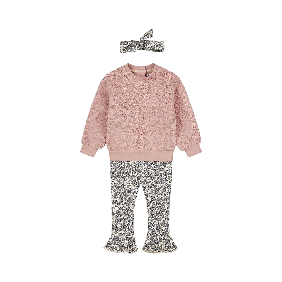 Met deze set is je meisje helemaal klaar voor de winterdagen! De zachte teddy sweater in het schattige zachtroze is heerlijk warm en heeft een speelse uitstraling. De bijpassende off white broek met bloemetjes en het gerafelde randje aan de pijpjes maken het helemaal af. De set wordt compleet gemaakt met een bijpassende haarband met bloemetjes.