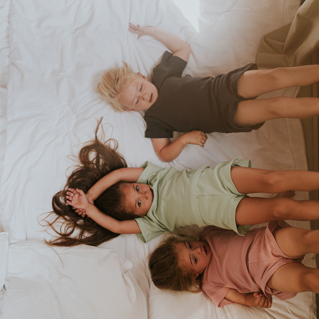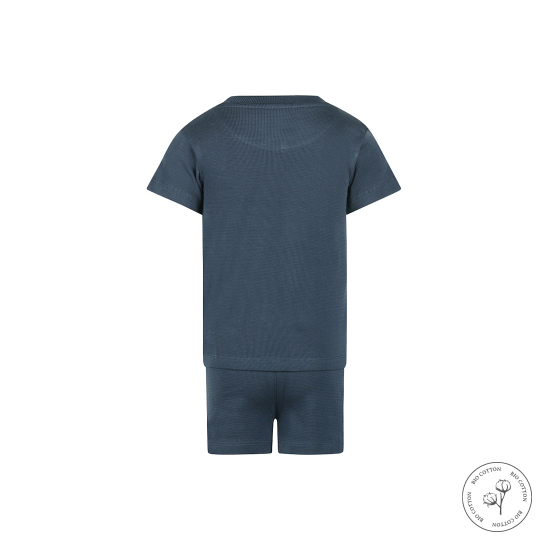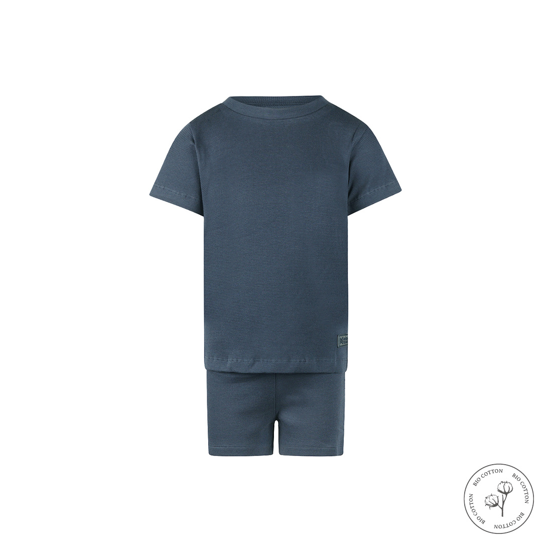 Koko Noko unisex shortama navy met T-shirt en short in wafelstructuur. Gemaakt van 100% biologisch katoen, zacht, ademend en comfortabel. Een fijne pyjama voor jongens en meisjes.