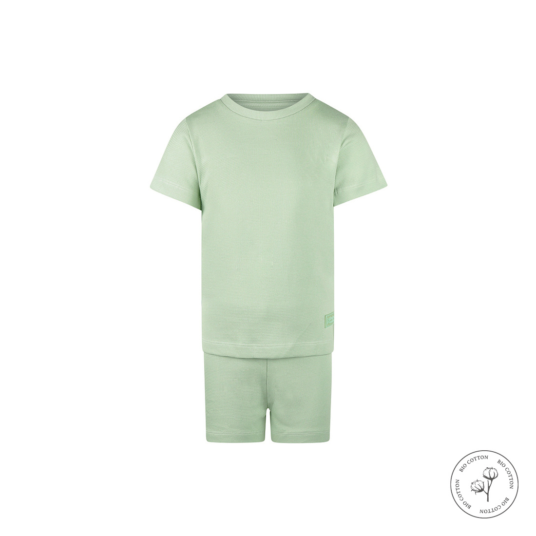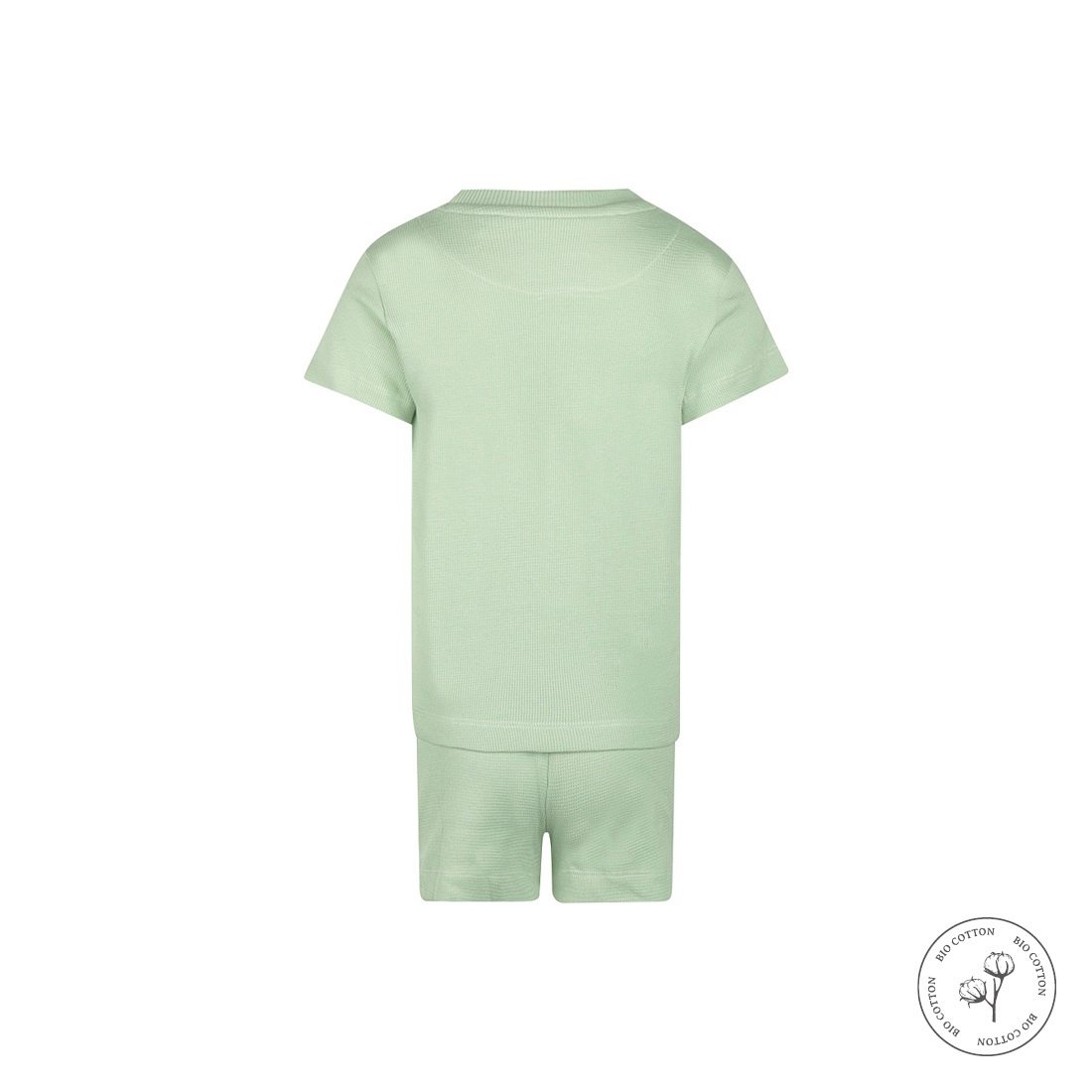 Koko Noko unisex shortama zachtgroen met luchtige wafel katoen. 100% biologisch katoen voelt zacht en soepel aan en slaapt heerlijk. Een fijne keuze voor elke nacht.